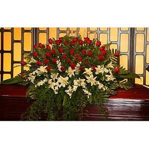 Red and white classic piece makes a nice floral presentation for a memorial service.